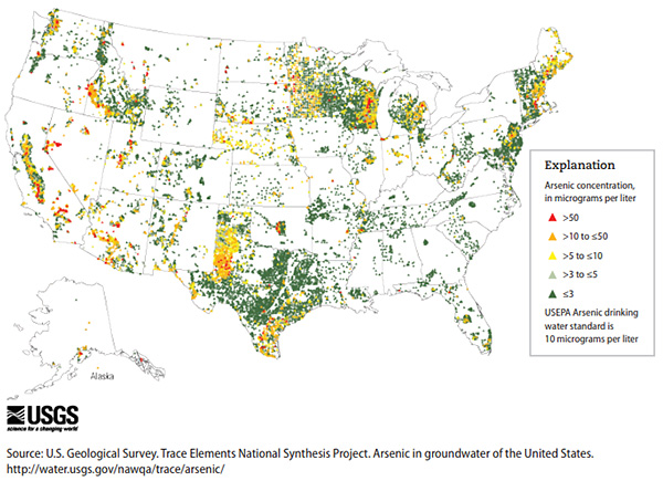 Many communities may have high levels of arsenic in their drinking water, particularly from private wells, because of contamination or as a result of the geology of the area. The north central region and the western region of the United States have the highest arsenic levels in surface water and groundwater sources, respectively. Wells used to provide water for drinking and cooking should be tested for arsenic. As of January 2006, EPA’s Maximum Contaminant Level (MCL) for arsenic in drinking water is 10 ppb. If you have arsenic in your drinking water at levels higher that the EPA’s MCL, an alternative source of water used for drinking and cooking should be considered.