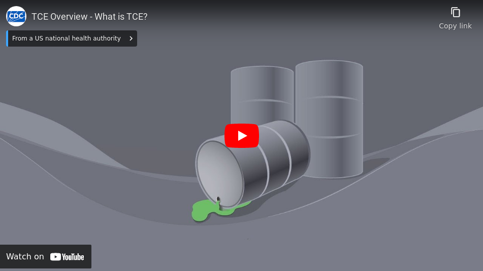 Trichloroethylene, or TCE, is a man-made chemical. It’s primarily used as a solvent. TCE is a clear, colorless liquid with a sweet, fruity odor. We’ve made it green in the illustrations. TCE is considered a volatile organic compound, or VOC, because it evaporates easily into the air.