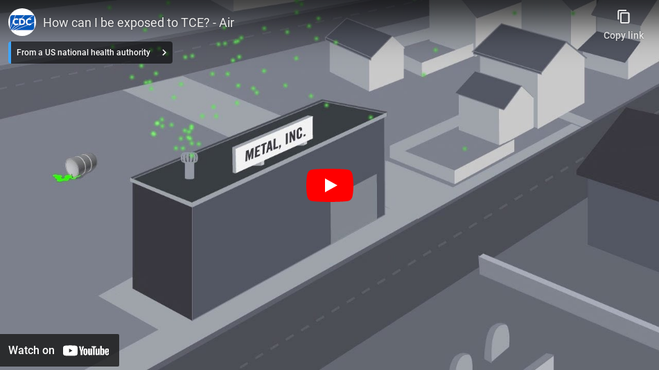 Most TCE that’s released into the atmosphere is from degreasing operations. People who live closer to industries using TCE have higher concentrations of TCE in their air than those who live further away. Workers in factories where TCE is manufactured or used are exposed to higher concentrations than the general public. In the past, open disposal of TCE also released TCE vapors into the air. TCE evaporates into the air when consumer products containing TCE are used in the home. TCE in contaminated soil, or more likely contaminated groundwater, can form a vapor that migrates through the soil into the home. This exposure route is known as vapor intrusion. Vapors can enter the home through cracks in the foundation, the sump pump, or through openings where utility lines enter the home.
