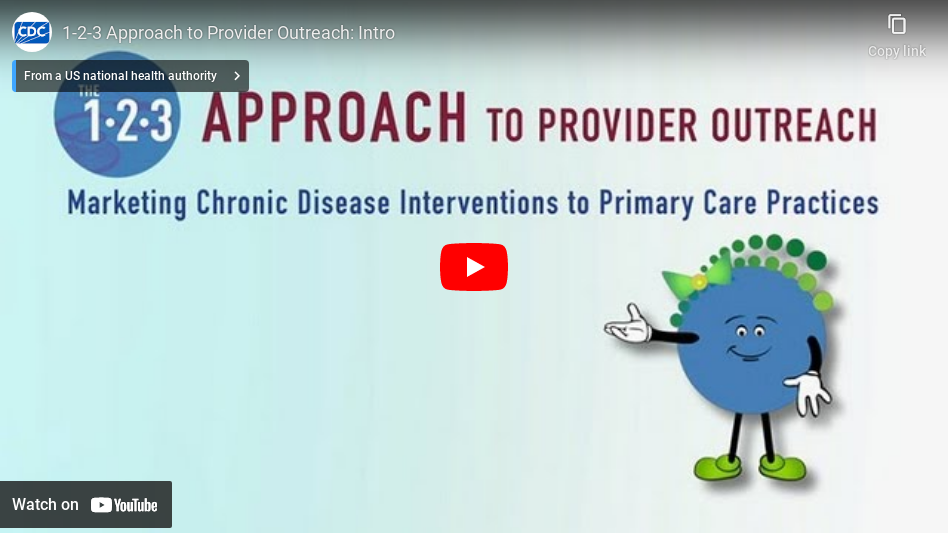 The 1.2.3 Approach to Provider Outreach is a social marketing strategy aimed at raising awareness among primary care providers (PCPs) about the benefits of community-based chronic disease self-management education and physical activity interventions. The approach is built around direct-to-provider outreach to encourage PCPs to recommend local self-management classes to their patients with chronic disease. This video introduces you to the 1.2.3 Approach and follows a novice marketer as she makes initial contact with a local practice.