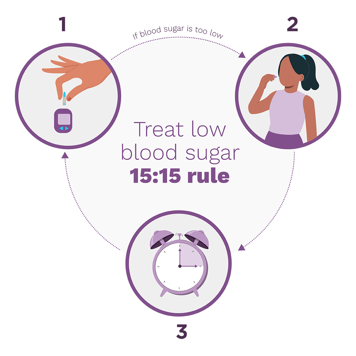 When your blood sugar is low (55–69 mg/dL), use the 15-15 rule to raise your blood sugar.
