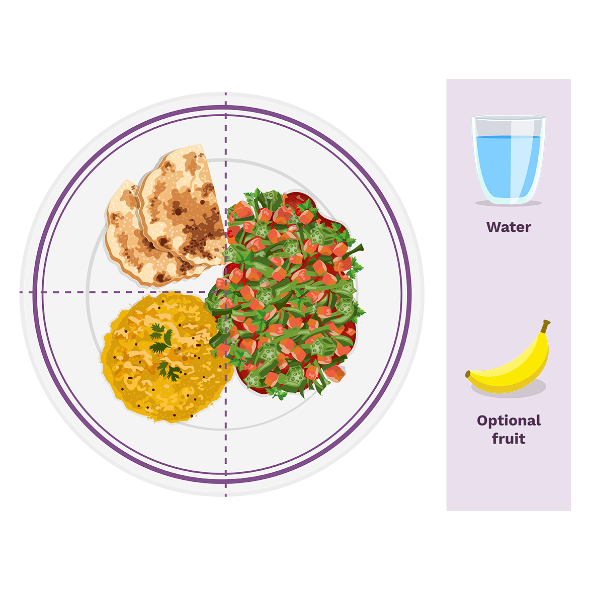 A healthy Indian plate may have 1/2 bhindi masala (spiced, sautéed okra, onion, and tomatoes), 1/4 dal (lentils), and 1/4 whole grain roti (bread).