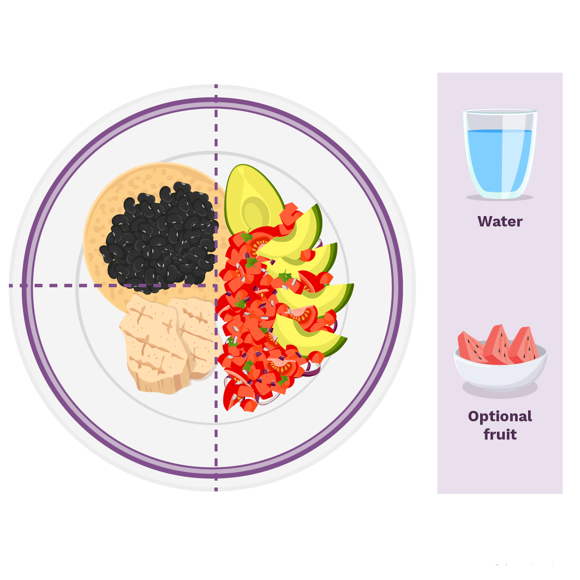 image showing portions on a plate of nonstarchy vegetables at 50, carb foods at 24 and protein foods at 25 per cent. Also shows image of water or 0-calorie drink.