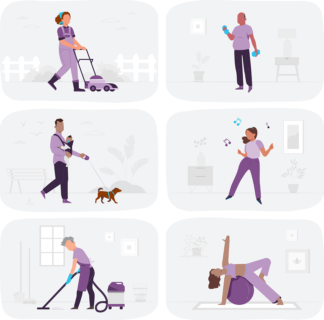 Moderate-intensity physical activity can be part of everyday living. This could include yardwork, lifting weights, walking, dancing, housework, or yoga. Try for at least 20-25 minutes every day.