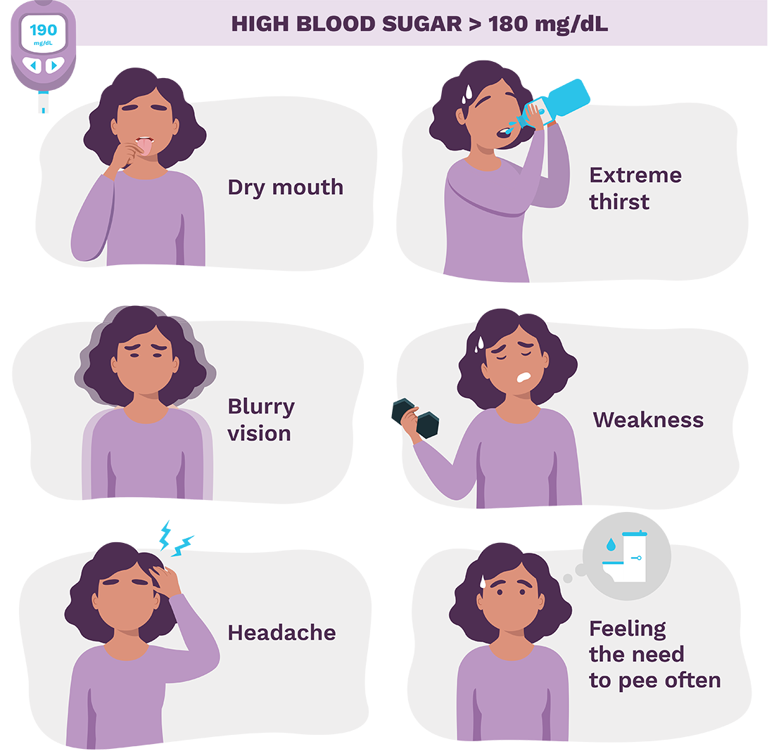 High blood sugar symptoms are dry mouth, extreme thirst, blurry vision, weakness, headache, and feeling the need to urinate often.