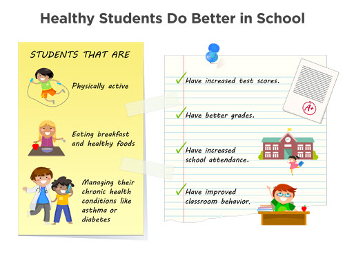 Health and learning are strongly connected. Evidence supports that healthy students perform better in school. For example, the connection between students being physically active, eating healthy foods, and managing their chronic health conditions, and improved test scores, grades, school attendance, and classroom behaviors, such as being focused and not getting into trouble, is supported by research.