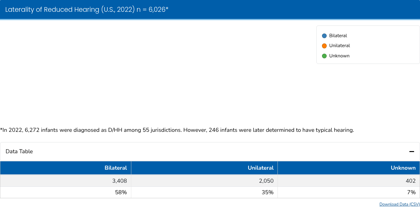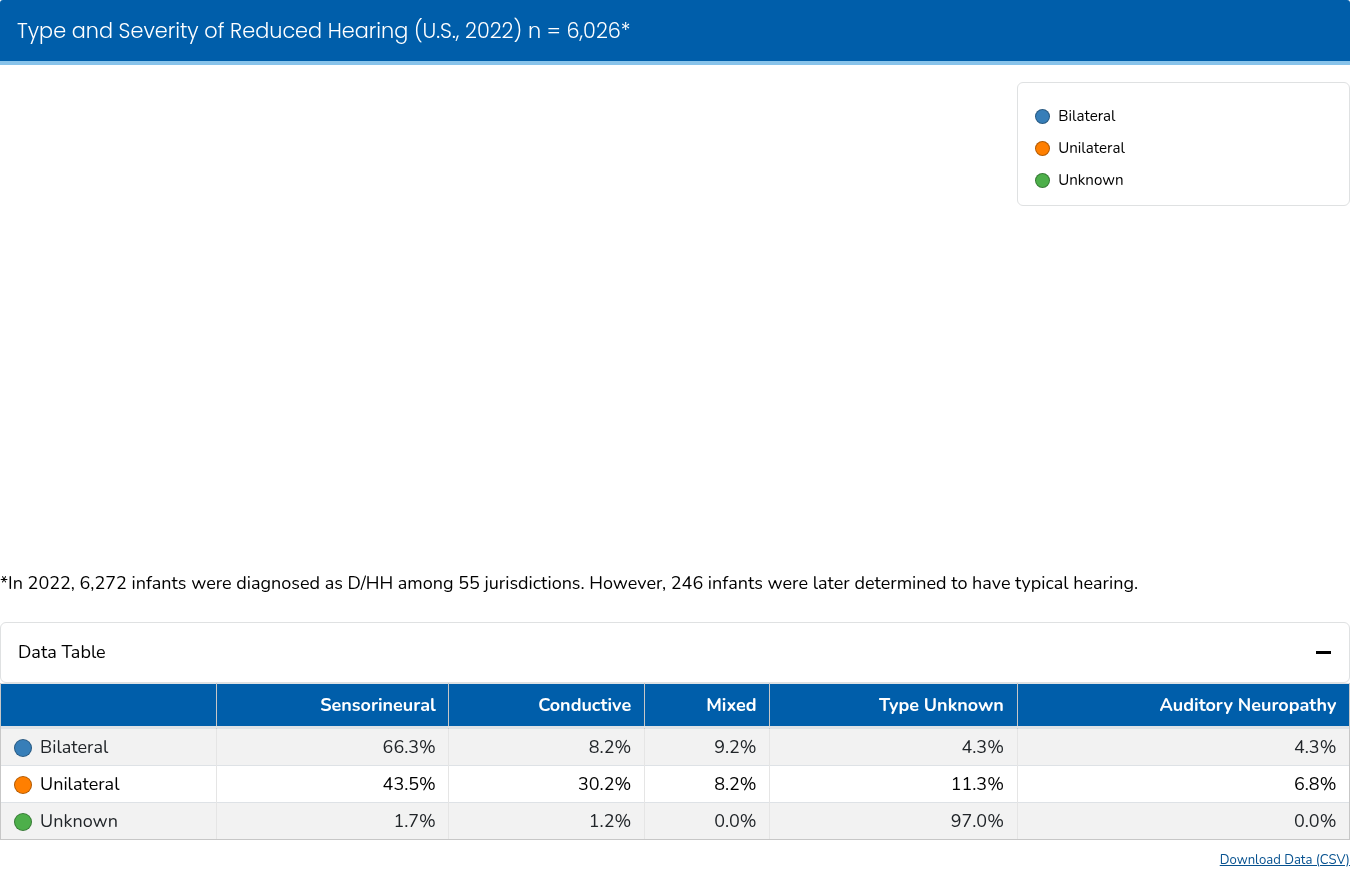 This summary highlights type, severity, and laterality of reduced hearing for babies born between January 1, 2022 and December 31, 2022. Categories are based on the American Speech-Language-Hearing Association (ASHA) classification system for reduced hearing. The ASHA categories are as follows: