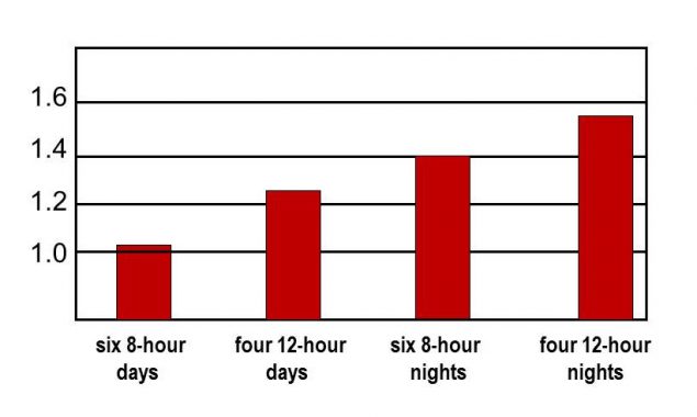 Both shift length and shift time influence risks. After looking at findings from several studies, researchers estimated the chance for errors and incidents for four types of shift schedules that all use 48 hours of work per week.45 The shift schedules were day work with six 8-hour shifts and four 12-hour shifts, and night work with six 8-hour shifts and four 12-hour shifts. The researchers estimated that the highest risk is for shifts that are both long and during the night (see Figure 3.1).