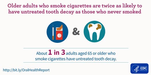 Older adults who smoke cigarettes are twice as likely to have untreated tooth decay as those who never smoked.