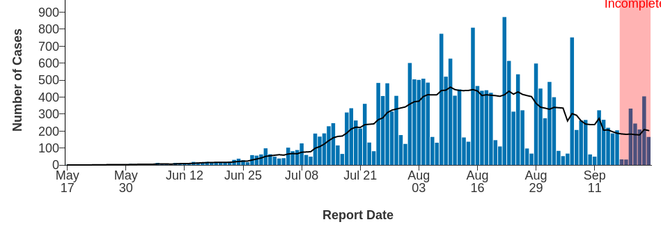 We estimate the time-varying reproduction number (Rt), which is the average number of secondary cases infected by a single primary case in a large population, has been below 1 since July 31 (Figure 7). Analyses were conducted using the EpiNow2 package, which adjusts for truncated data and reporting delays, using three parameter distributions: generation interval, incubation period, and delay from symptom onset to report date.3