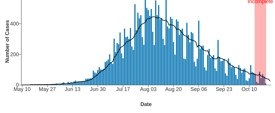 We estimate the time-varying reproduction number (Rt), which is the average number of secondary cases infected by a single primary case in a large population, has been below one since late July (Figure 10). Analyses were conducted using the EpiNow2 package, which adjusts for truncated data and reporting delays, using three parameter distributions: generation interval, incubation period, and delay from symptom onset to report date.4