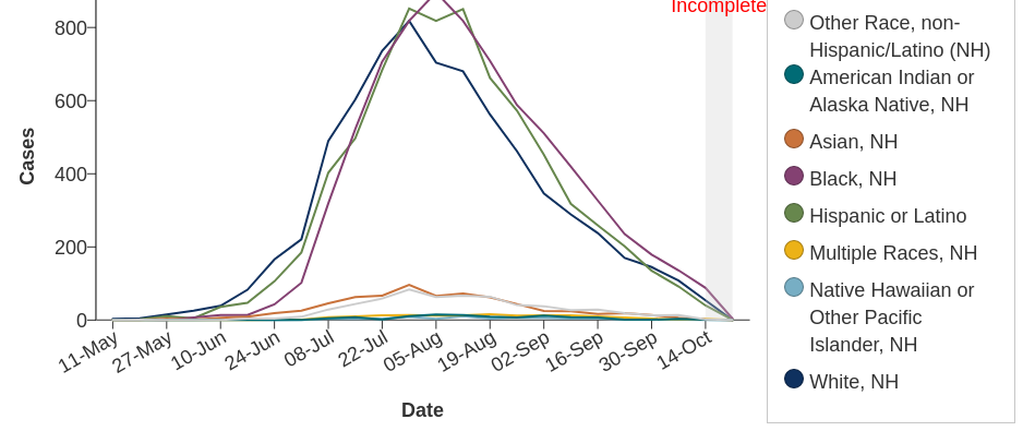 Figure 5. 7-day moving average of monkeypox cases by race/ethnicity and date (defined as the earliest among the date of illness onset, positive laboratory test report date, CDC call center reporting date, or case data entry date into CDC’s emergency response common operating platform, DCIPHER) and counts of monkeypox cases by race/ethnicity and week as of October 21, 2022. The Hispanic or Latino category includes people of any race, and all other categories exclude those who identify as Hispanic or Latino. Data for some cases may be updated when additional information is provided to CDC via DCIPHER.