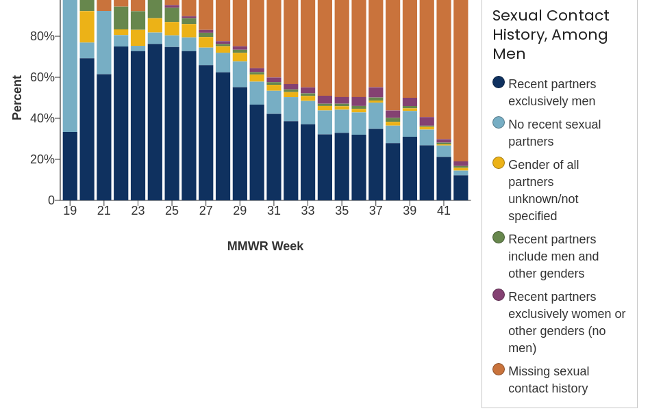 Recent sexual history is defined as any sex or close intimate contact in the three weeks preceding symptom onset. Due to the small number of cases in women and those with another gender identity, we did not further break these groups down by reported sexual contact history. Among the 27,427 people (98.4% of all cases) with sex/gender data, 26,340 cases (96.0%) were men (cisgender and transgender men included). For this group, reported history of recent sexual contact (including missing data) was characterized (Figure 6). Among the men (n=26,340), a total of 11,140 cases (42.3%) reported recent partners who were exclusively men (i.e., male-to-male sexual contact, MMSC), 10,534 cases (40.0%) had missing sexual contact history, 2,837 cases (10.8%) reported no recent sexual partners, 732 cases (2.8%) reported recent sexual contact with partners of unknown or unspecified gender, 709 cases (2.7%) reported recent partners who were exclusively women or other genders (no men), and 388 cases (1.5%) reported partners who were men and other genders (Figure 6). We note increasing proportions of cases missing data in this variable over time in conjunction with a declining proportion of cases reporting MMSC (discussed in more detail in the Dynamics of U.S. Outbreak in Technical Report 3). Some jurisdictions also report sexual orientation of cases to the CDC. Sexual orientation was reported in previous technical reports using data collected during early iterations of case reporting to CDC but is no longer nationally reported and is not included in this report.