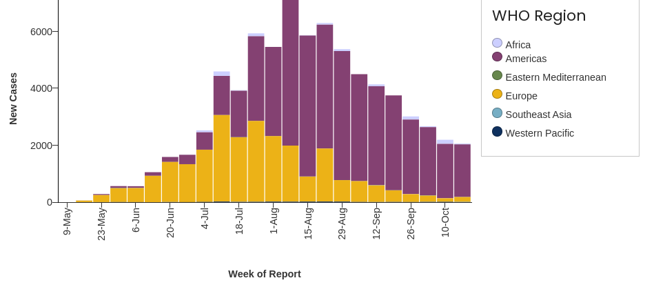 Figure 13. Weekly new monkeypox cases by WHO region globally as of October 21, 2022. CDC, WHO, European CDC, US CDC, and Ministries of Health.