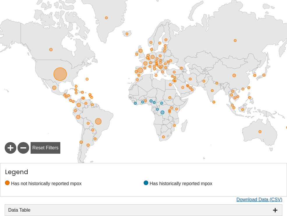 Notes: Case data reported since January 1, 2022 are provided for situational awareness and subject to change. Confirmed cases include those laboratory-confirmed as mpox virus and may include cases only confirmed as orthopoxvirus. Among locations (including countries, territories, and areas) that have not historically reported mpox, several have reported sporadic cases linked to travel or imported animals prior to 2022. Additionally, Ghana has not historically reported mpox cases, however, the country was identified as the source of a shipment of wild mammals that subsequently led to the 2003 outbreak in the U.S.