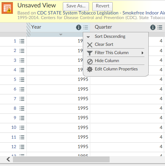 A user may hide, sort, or filter a dataset column when working in the Tobacco Use Data Portal.