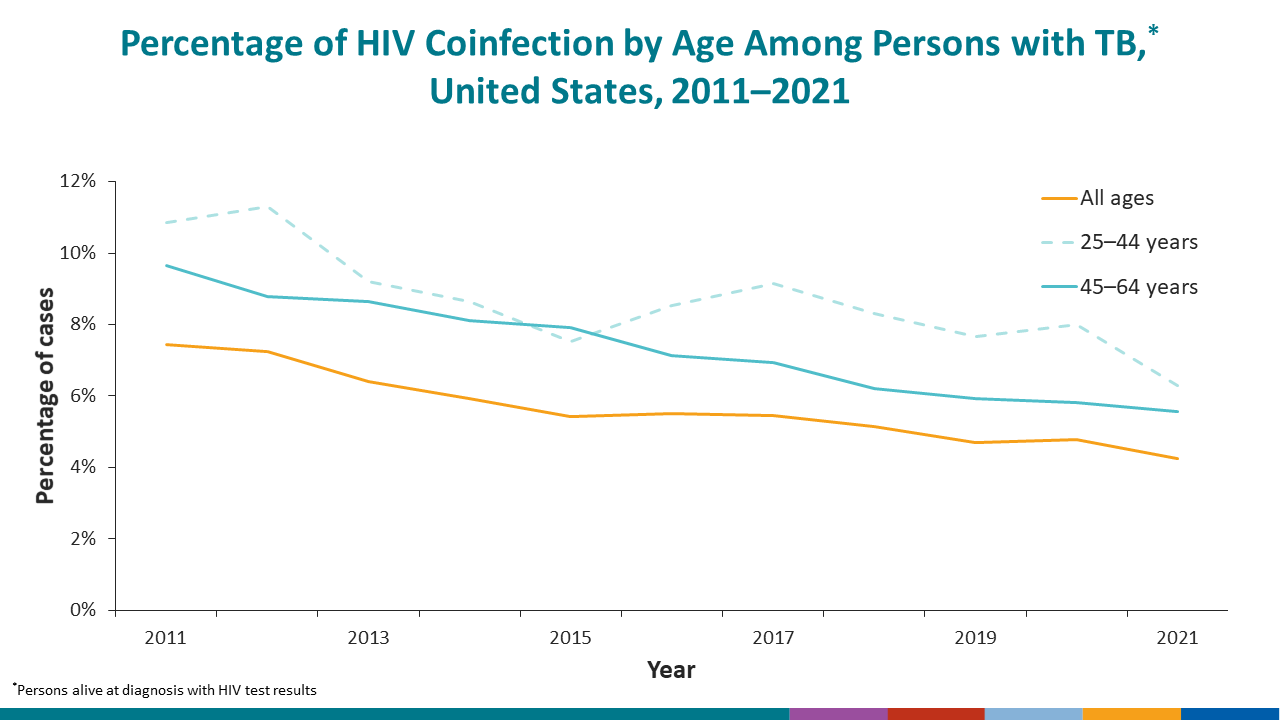 Among persons with TB disease and known HIV status, HIV coinfection occurred for 6.3% of persons aged 25–44 years and 5.6% of persons aged 45–64 years (TB Among Persons with HIV Coinfection: 2011–2021).