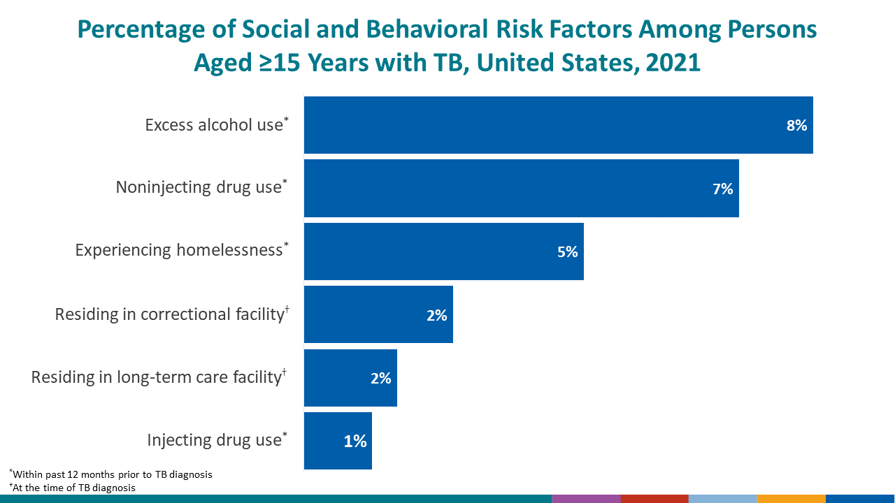 Substance use is also a risk factor for TB disease. In 2021, among persons with TB disease who were 15 years of age or older, the most commonly reported type of substance use during the year preceding diagnosis was
