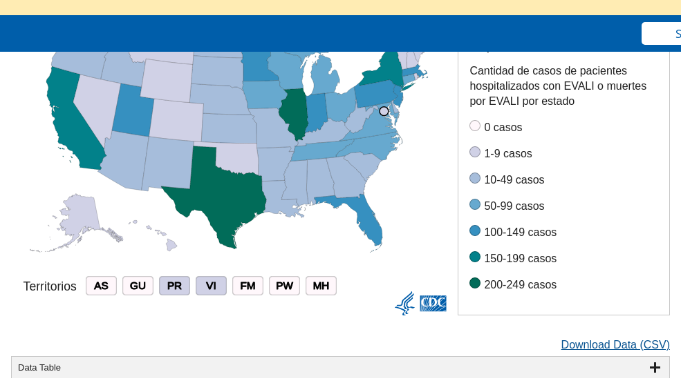 - Hasta el 18 de febrero del 2020, se había notificado a los CDC un total de 2807 casos de pacientes hospitalizados con lesión pulmonar asociada al uso de productos de cigarrillos electrónicos o vapeo (EVALI) o muertes por EVALI de 50 estados, el Distrito de Columbia y dos territorios estadounidenses (Puerto Rico y las Islas Vírgenes de los Estados Unidos).